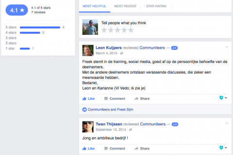 Ga jij ook altijd eerst op zoek naar reviews? Dan ben je niet de enige. Uit onderzoek van OpenCompanies blijkt dat 92% (van de ondervraagden) online reviews bekijkt. Daarnaast geeft het onderzoek aan dat 42% van de ondervraagden reviews zelfs meer vertrouwt dan feitelijke cijfers. Naast onafhankelijke vergelijkingssites en je eigen website kun je als bedrijf ook op je Facebookpagina reviews ontvangen. Hoe? Lees het hier.
