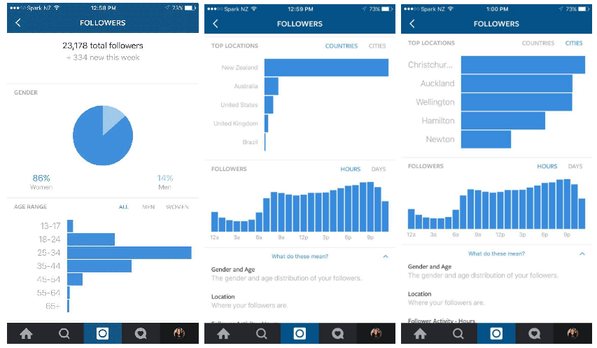 - Inzicht in je statistieken: De knop voor het weergeven van je statistieken is te vinden naast je naam. Vanaf het moment dat je werkt met een bedrijfsprofiel kan je zien hoe vaak je bericht is bekeken, het unieke bereik van het bericht en het aantal vind-ik-leuks en reacties. Daarnaast krijg je meer informatie over je volgers. De statistieken geven een overzicht over het geslacht, de leeftijd, de locatie van je volgers en hoe laat deze volgers actief zijn.