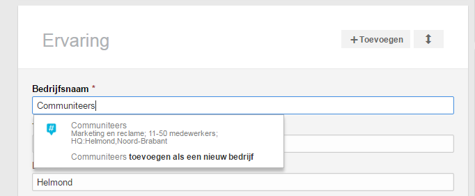 Vraag je collega’s om hun persoonlijke LinkedIn profiel met de bedrijfspagina te verbinden. Dit doen ze door bij hun huidige werkervaring de naam van je bedrijf in te typen. De bedrijfspagina wordt dan zichtbaar en zodra ze deze aanklikken is hun persoonlijke profiel met de bedrijfspagina verbonden.