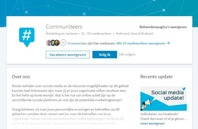 Gefeliciteerd! Je beschikt nu over een professionele Linkedin bedrijfspagina. Met dit bedrijfsprofiel is jouw bedrijf beter vindbaar op internet en blijven de volgers op de hoogte van jullie interessante bezigheden.