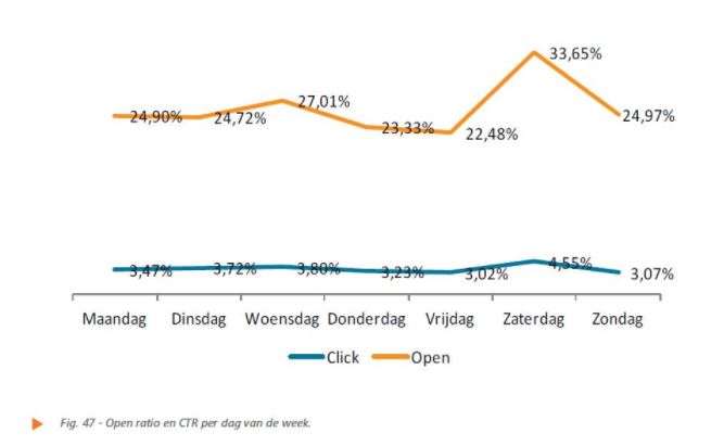 Verstuur je nieuwsbrief op vaste tijdstippen, maar niet te vaak. Kijk als bedrijf wat haalbaar is, of dat nou een keer per maand is of een keer per kwartaal. Gebruik voor dagelijkse berichten aan jouw doelgroep je social media kanalen. Daarnaast maakt het tijdstip wanneer je een e-mail verstuurt ook uit. Zoals je kunt zien in onderstaande grafiek (een voorbeeld van statistieken van een nieuwsbrief), kun je je nieuwsbrief in dit geval het beste op een zaterdag versturen omdat dan de meeste mensen hun mail openen (gele lijn). Bovendien ligt de click-through rate (wanneer mensen op een link klikken in de nieuwsbrief) het hoogste in het weekend. Dit is echter niet altijd het geval. Je zou namelijk moeten testen op welke dag jouw nieuwsbrief het vaakst wordt geopend.
