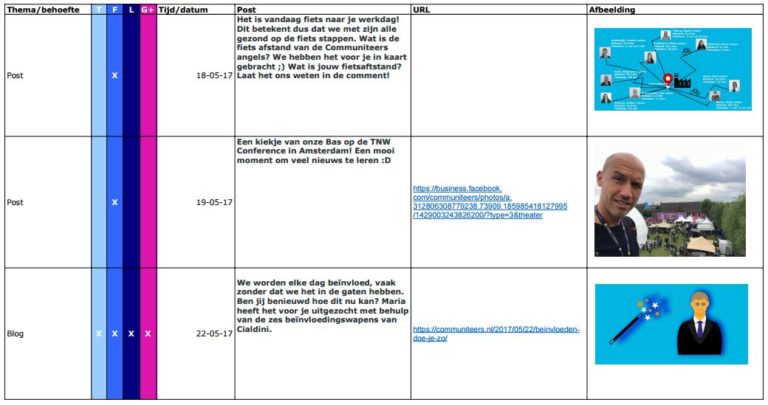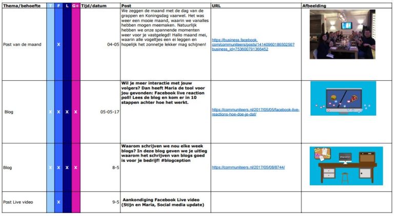 Elke maand wordt er een contentkalender gemaakt voor het plaatsen van berichten van Communiteers. We laten je een stuk van een van onze contentkalender zien van de maand mei, als voorbeeld en ter inspiratie.