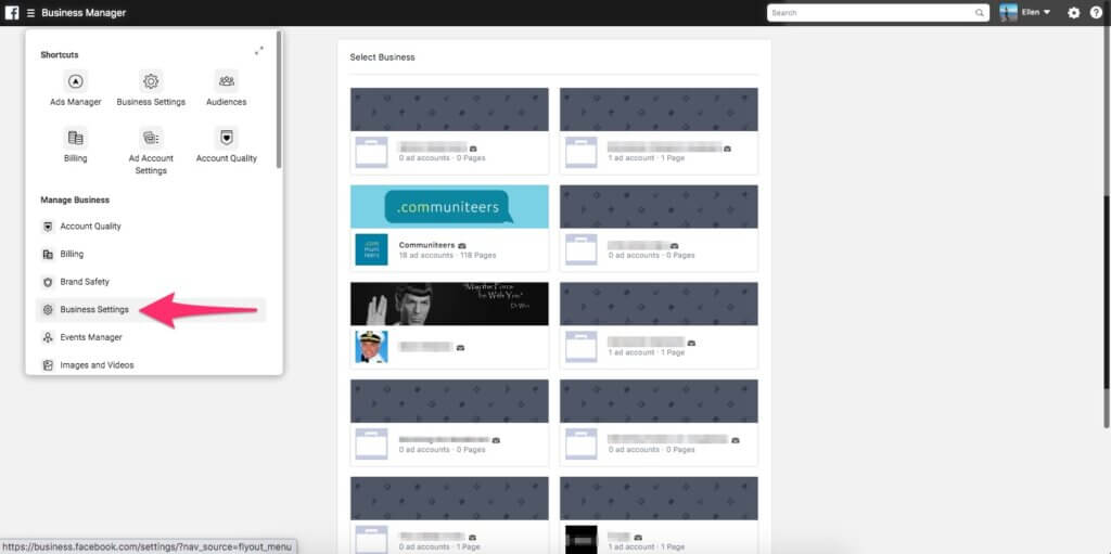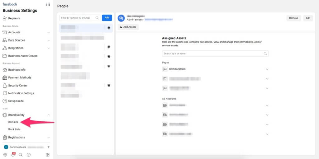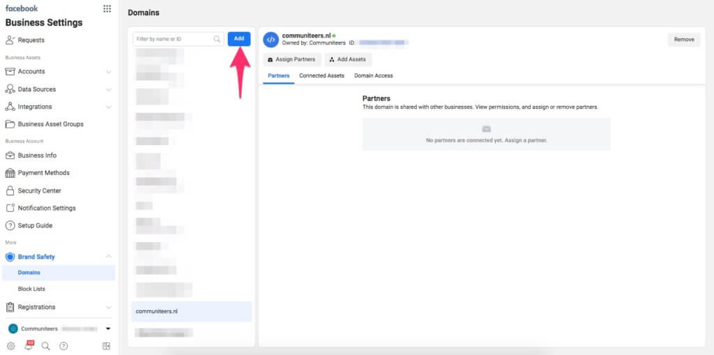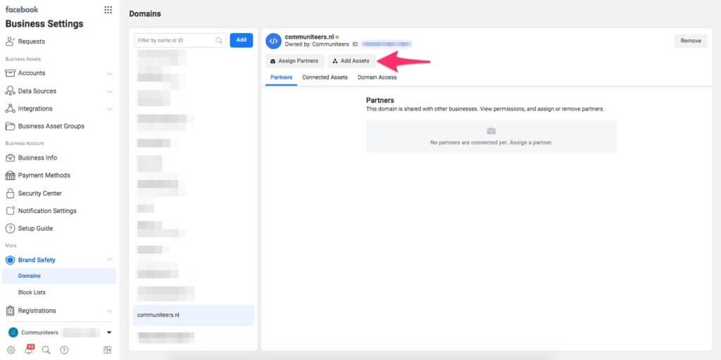 Ga naar Business Manager en vervolgens naar de Business Settings. In het menu aan de linkerkant klik je onder Brand Safety op Domains.
