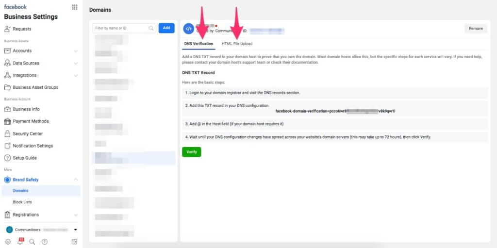 Zodra de code of het bestand is toegevoegd, klik je in Business Manager op de groene button Verify (op het ene of het andere tabblad, dat ligt aan welke methode je gebruikt).