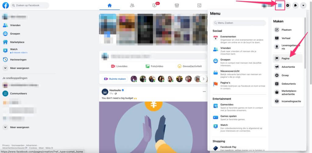 Ga naar https://www.facebook.com/pages/creation of via het menu met de 9 blokjes naar ‘Pagina’ onder ‘Maken’: