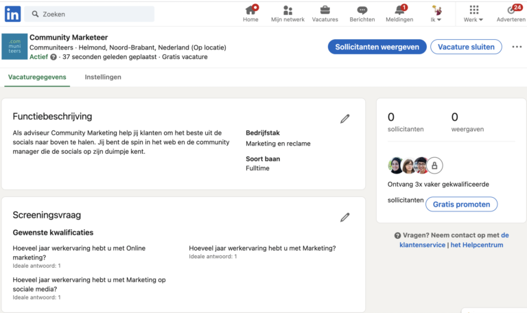 Uiteraard kun je nog een stapje verder gaan met LinkedIn, bijvoorbeeld met LinkedIn Premium. Hiermee krijg je nog meer mogelijkheden en een beter bereik met je advertenties. Wil je dit niet, dan heb je nog de mogelijkheid om de vacature op LinkedIn te promoten met een betaalde advertentie. Zo komt de vacature ook bij een grotere groep potentiële collega’s voorbij. Uiteraard allemaal op LinkedIn. Voor slechts €10,- per dag kun je al adverteren op LinkedIn.